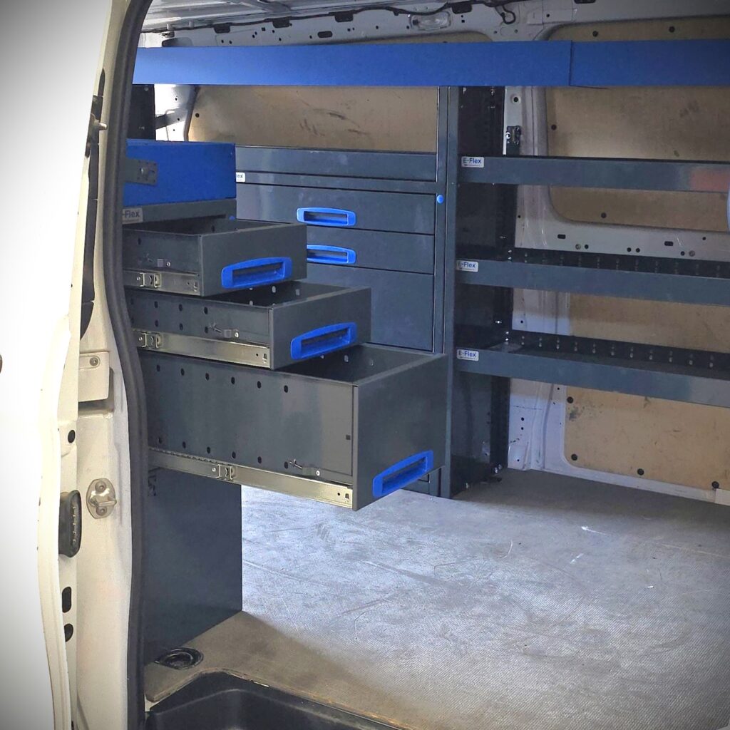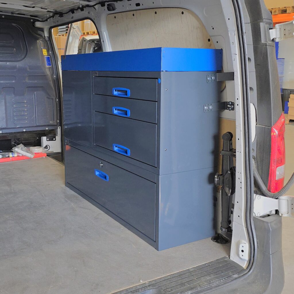 – 127 cm päädystä aukeava hyllykkö / laatikosto vetolaatikoilla