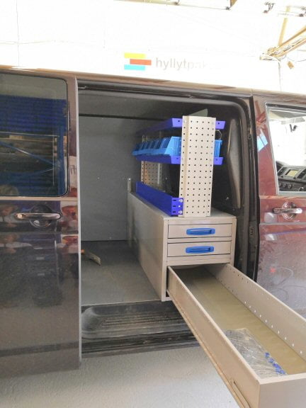 ”Tällainen kalustus sopii loistavasti maanrakennusalan yrittäjälle. Pitkien ulos aukeavien vetolaatikoiden johdosta ei tarvitse nousta autoon joka kerta, kun hakee tavaraa.”