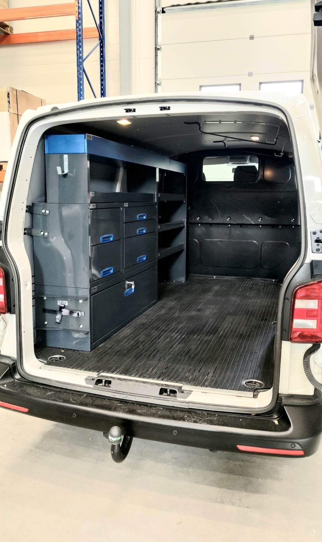 Volkswagem Transporter huoltoautokalusteet kiinteistöhuoltajalle, asiakaskokemus. Asennus Juvanmalmilla. Vuo-kiinteistöpalvelut Oy, Juha Ohtonen. Volkswagen Transporter L2H1, 31.8.2022
