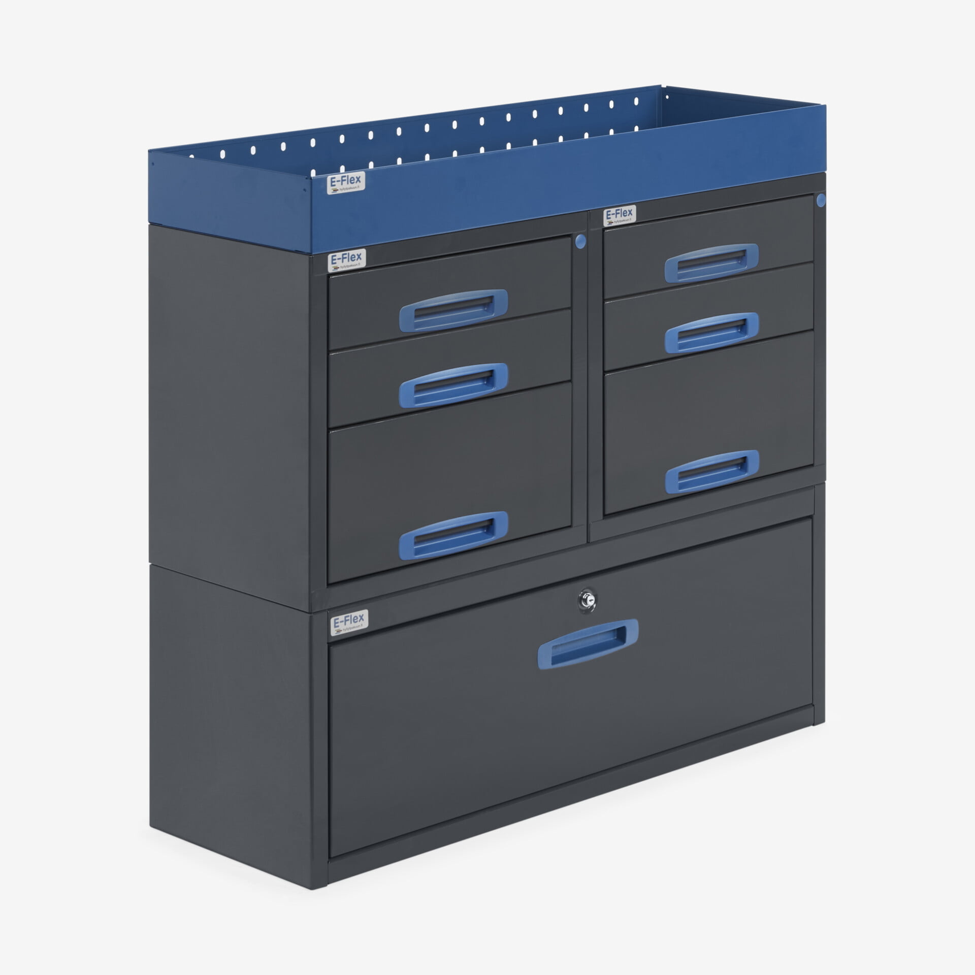 Jämerät E-Flex pakettiauton hyllyköt / laatikostot ovat suosittuja ja monipuolisia pakettiauton kalusteita. Kalusteessa on yhdistetty vetolaatikoita, avohyllyjä ja muita säilytystiloja. Hyllykkö- / laatikostojen pääväri on pulverimaalattu antrasiitti ja toisena värinä on tyylikäs pulverimaalattu sininen. Moduuleista koosttuvat tuotekokonaisuudet on helppo ja selkeä kasata sekä asentaa. Tuotekokonaisuudet ovat moduulirakenteensa vuoksi myös hyvin muunneltavissa. Vetolaatikostojen kiskot ovat kuulalaakeroituja (kantavuus 40 kg) ja tehty nimenomaan pakettiautoja varten eli laatikot lukittuvat paikalleen sekä auki että kiinni -asennoissa eivätkä aukeile itsekseen ajon aikana. Annamme tuotteille 10 vuoden takuun, joka takaa että nämä todella kestävät vaativammassakin ammattikäytössä. Täydennä kalusteesi tarvittavilla lisävarusteilla.