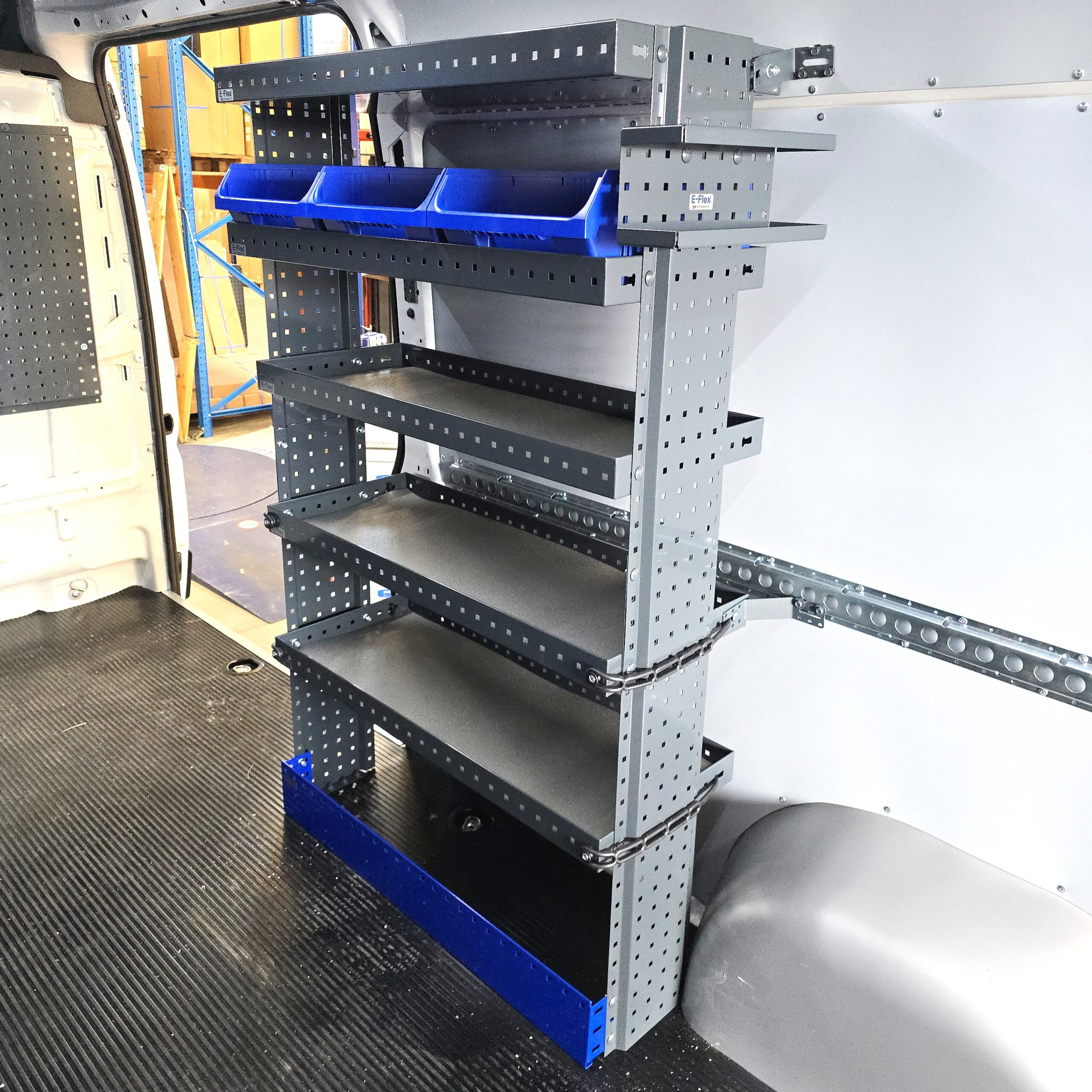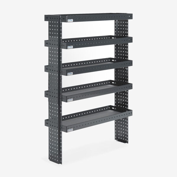 E-Flex 100 cm pakettiauton hylly viidellä korkeus-säädettävällä hyllytasolla. Avohylly pitää pakettiauton järjestyksessä tyylikkäästi ja helposti.