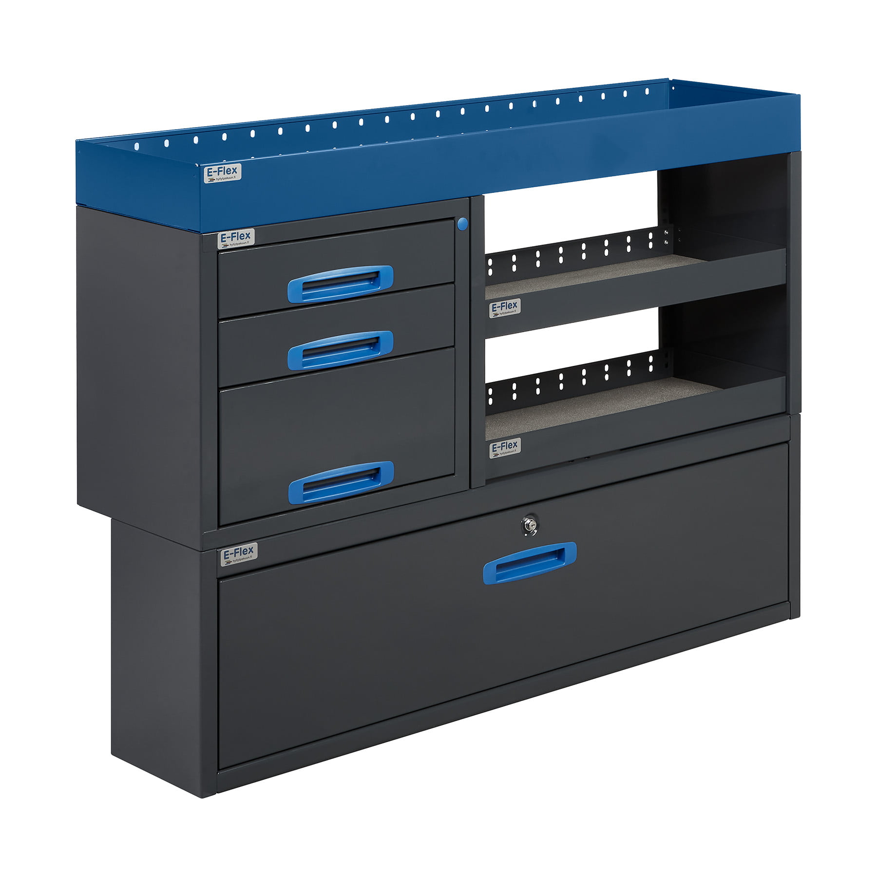 Tämä kompakti hyllystö on suosittu valinta seuraaviin pakettiautomalleihin lyhyelle sivuseinälle: Citroen Jumpy pitkä (XL), Fiat Scudo pitkä, Opel Vivaro pitkä (L2), Peugeot Expert (XL), Toyota Proace pitkä L2. Erityisenä etuna on kapea alakaappi, joka on suunniteltu sopimaan täydellisesti pyöräkotelon kohdalle näissä automalleissa, joissa tavaratila on täsmälleen samanlainen. Tämä tekee siitä optimaalisen ratkaisun tilanteisiin, joissa tavallinen alakaappi ei sovi pyöräkotelon kohdalle. Täydennä kalusteesi tarvittavilla lisävarusteilla.