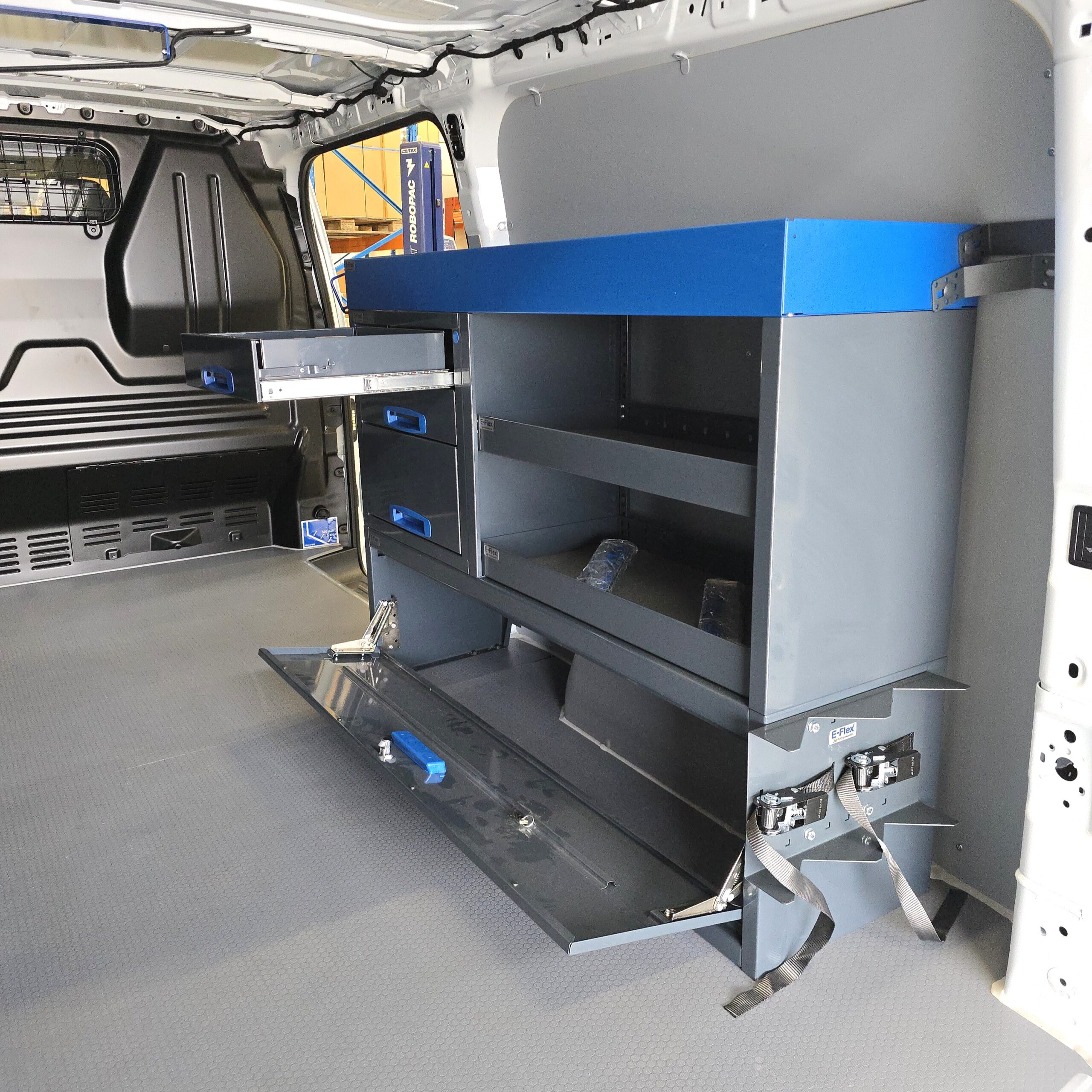 Jämerät E-Flex pakettiauton hyllyköt / laatikostot ovat suosittuja ja monipuolisia pakettiauton kalusteita. Kalusteessa on yhdistetty vetolaatikoita, avohyllyjä ja muita säilytystiloja. Hyllykkö- / laatikostojen pääväri on pulverimaalattu antrasiitti ja toisena värinä on tyylikäs pulverimaalattu sininen. Moduuleista koosttuvat tuotekokonaisuudet on helppo ja selkeä kasata sekä asentaa. Tuotekokonaisuudet ovat moduulirakenteensa vuoksi myös hyvin muunneltavissa. Vetolaatikostojen kiskot ovat kuulalaakeroituja (kantavuus 40 kg) ja tehty nimenomaan pakettiautoja varten eli laatikot lukittuvat paikalleen sekä auki että kiinni -asennoissa eivätkä aukeile itsekseen ajon aikana. Annamme tuotteille 10 vuoden takuun, joka takaa että nämä todella kestävät vaativammassakin ammattikäytössä. Täydennä kalusteesi tarvittavilla lisävarusteilla.