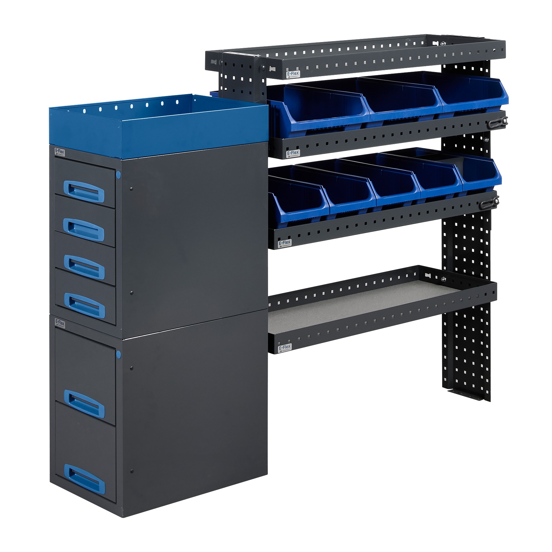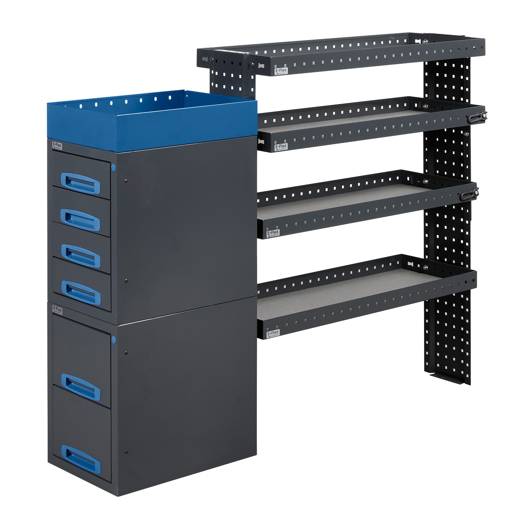 Jämerät E-Flex pakettiauton hyllyköt / laatikostot ovat suosittuja ja monipuolisia pakettiauton kalusteita. Kalusteessa on yhdistetty vetolaatikoita, avohyllyjä ja muita säilytystiloja. Hyllykkö- / laatikostojen pääväri on pulverimaalattu antrasiitti ja toisena värinä on tyylikäs pulverimaalattu sininen. Moduuleista koosttuvat tuotekokonaisuudet on helppo ja selkeä kasata sekä asentaa. Tuotekokonaisuudet ovat moduulirakenteensa vuoksi myös hyvin muunneltavissa. Vetolaatikostojen kiskot ovat kuulalaakeroituja (kantavuus 40 kg) ja tehty nimenomaan pakettiautoja varten eli laatikot lukittuvat paikalleen sekä auki että kiinni -asennoissa eivätkä aukeile itsekseen ajon aikana. Annamme tuotteille 10 vuoden takuun, joka takaa että nämä todella kestävät vaativammassakin ammattikäytössä. Täydennä kalusteesi tarvittavilla lisävarusteilla.