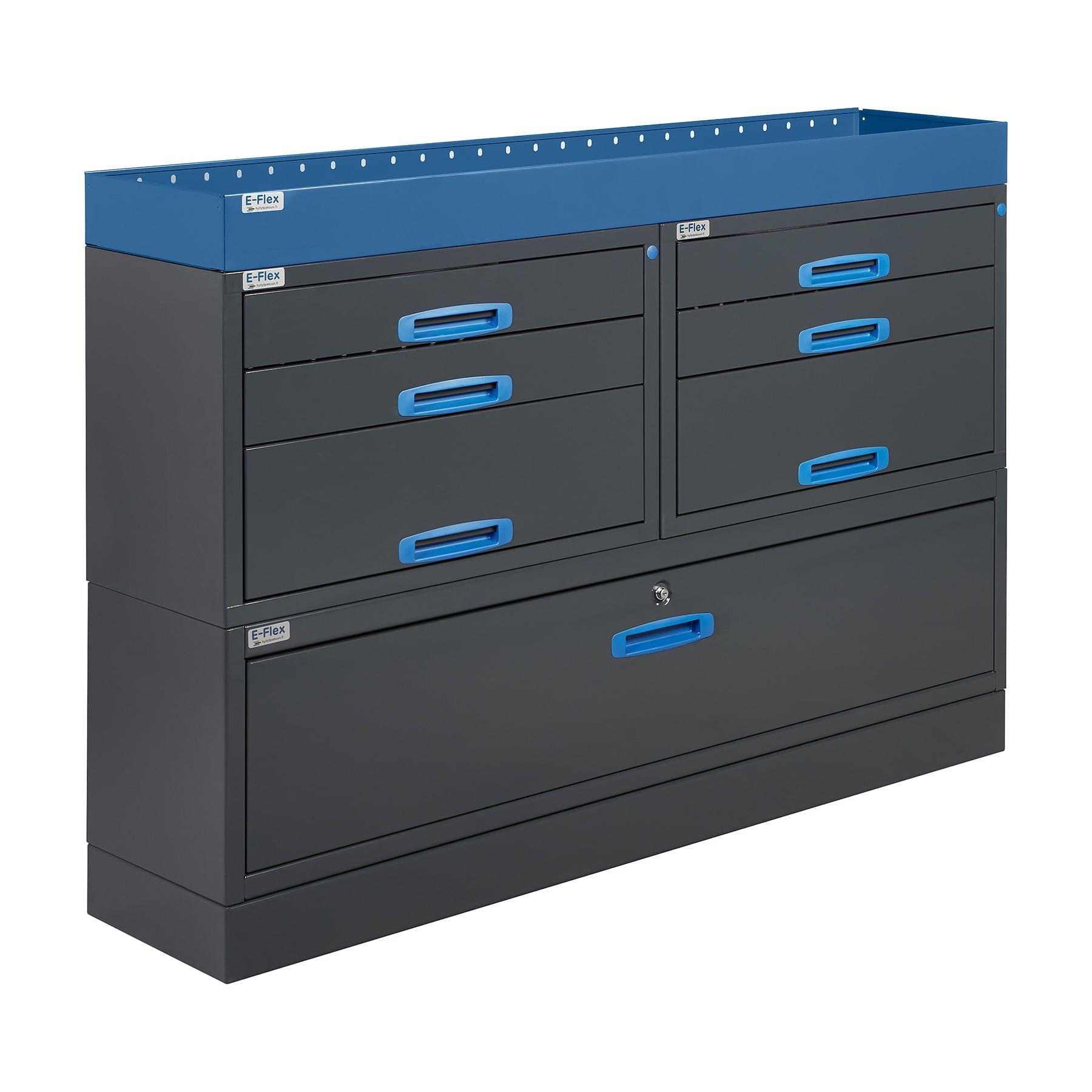 Jämerät E-Flex pakettiauton hyllyköt / laatikostot ovat suosittuja ja monipuolisia pakettiauton kalusteita. Kalusteessa on yhdistetty vetolaatikoita, avohyllyjä ja muita säilytystiloja. Hyllykkö- / laatikostojen pääväri on pulverimaalattu antrasiitti ja toisena värinä on tyylikäs pulverimaalattu sininen. Moduuleista koosttuvat tuotekokonaisuudet on helppo ja selkeä kasata sekä asentaa. Tuotekokonaisuudet ovat moduulirakenteensa vuoksi myös hyvin muunneltavissa. Vetolaatikostojen kiskot ovat kuulalaakeroituja (kantavuus 40 kg) ja tehty nimenomaan pakettiautoja varten eli laatikot lukittuvat paikalleen sekä auki että kiinni -asennoissa eivätkä aukeile itsekseen ajon aikana. Annamme tuotteille 10 vuoden takuun, joka takaa että nämä todella kestävät vaativammassakin ammattikäytössä. Täydennä kalusteesi tarvittavilla lisävarusteilla.