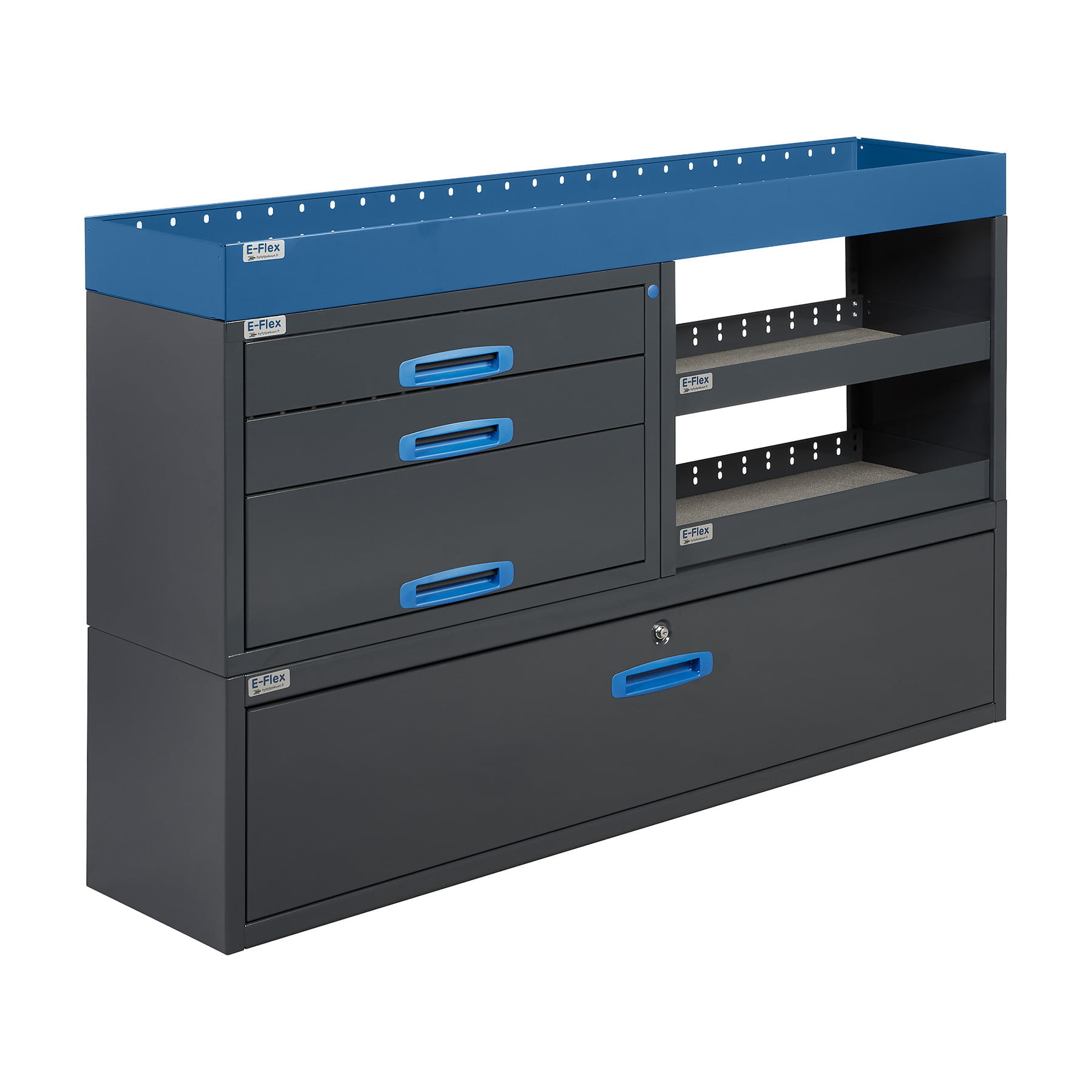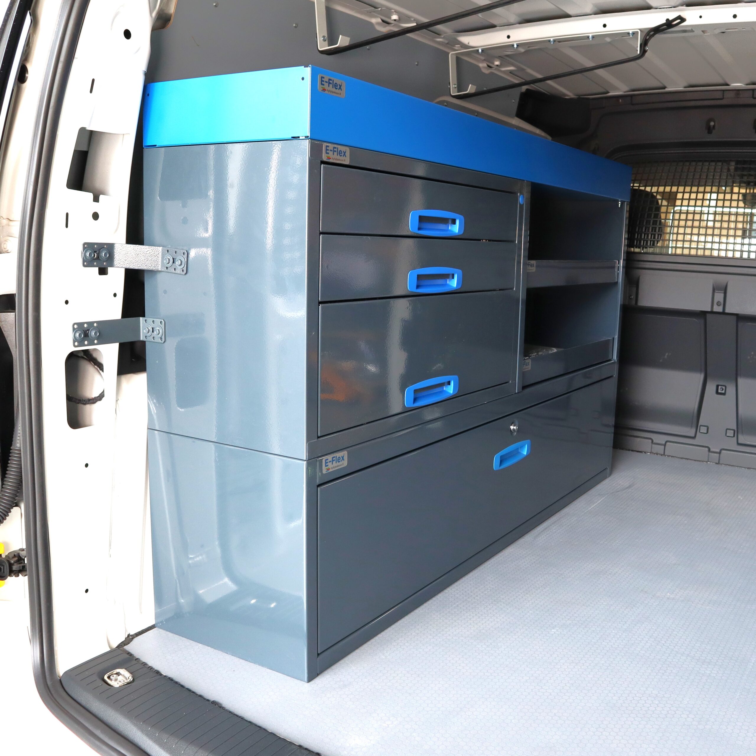 Jämerät E-Flex pakettiauton hyllyköt / laatikostot ovat suosittuja ja monipuolisia pakettiauton kalusteita. Kalusteessa on yhdistetty vetolaatikoita, avohyllyjä ja muita säilytystiloja. Hyllykkö- / laatikostojen pääväri on pulverimaalattu antrasiitti ja toisena värinä on tyylikäs pulverimaalattu sininen. Moduuleista koosttuvat tuotekokonaisuudet on helppo ja selkeä kasata sekä asentaa. Tuotekokonaisuudet ovat moduulirakenteensa vuoksi myös hyvin muunneltavissa. Vetolaatikostojen kiskot ovat kuulalaakeroituja (kantavuus 40 kg) ja tehty nimenomaan pakettiautoja varten eli laatikot lukittuvat paikalleen sekä auki että kiinni -asennoissa eivätkä aukeile itsekseen ajon aikana. Annamme tuotteille 10 vuoden takuun, joka takaa että nämä todella kestävät vaativammassakin ammattikäytössä. Täydennä kalusteesi tarvittavilla lisävarusteilla.
