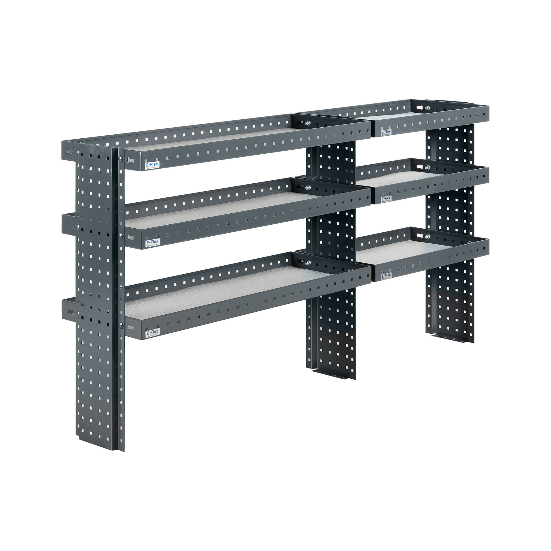 E-Flex 160 cm pakettiauton hylly kolmella korkeus-säädettävällä hyllytasolla. Avohylly pitää pakettiauton järjestyksessä tyylikkäästi ja helposti.