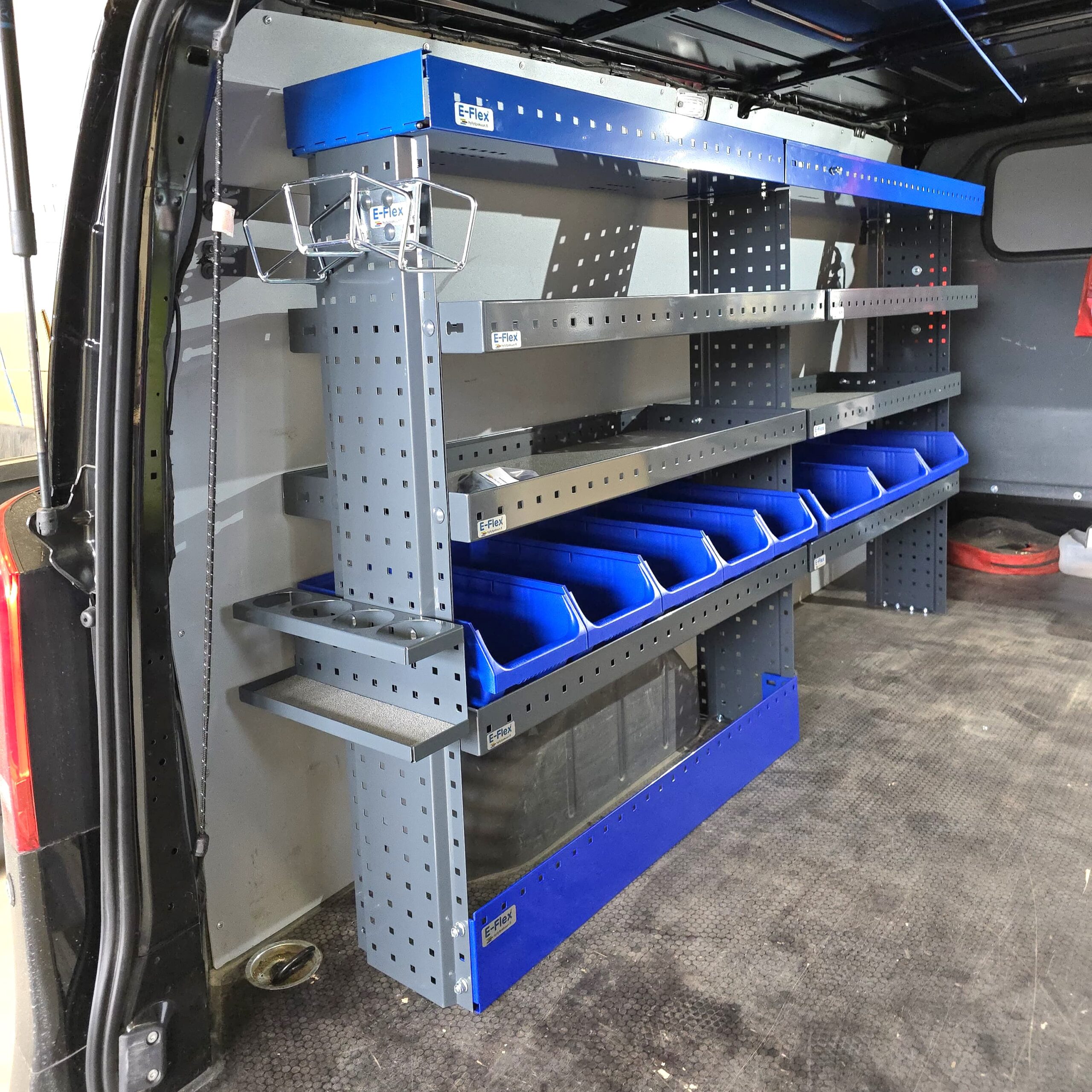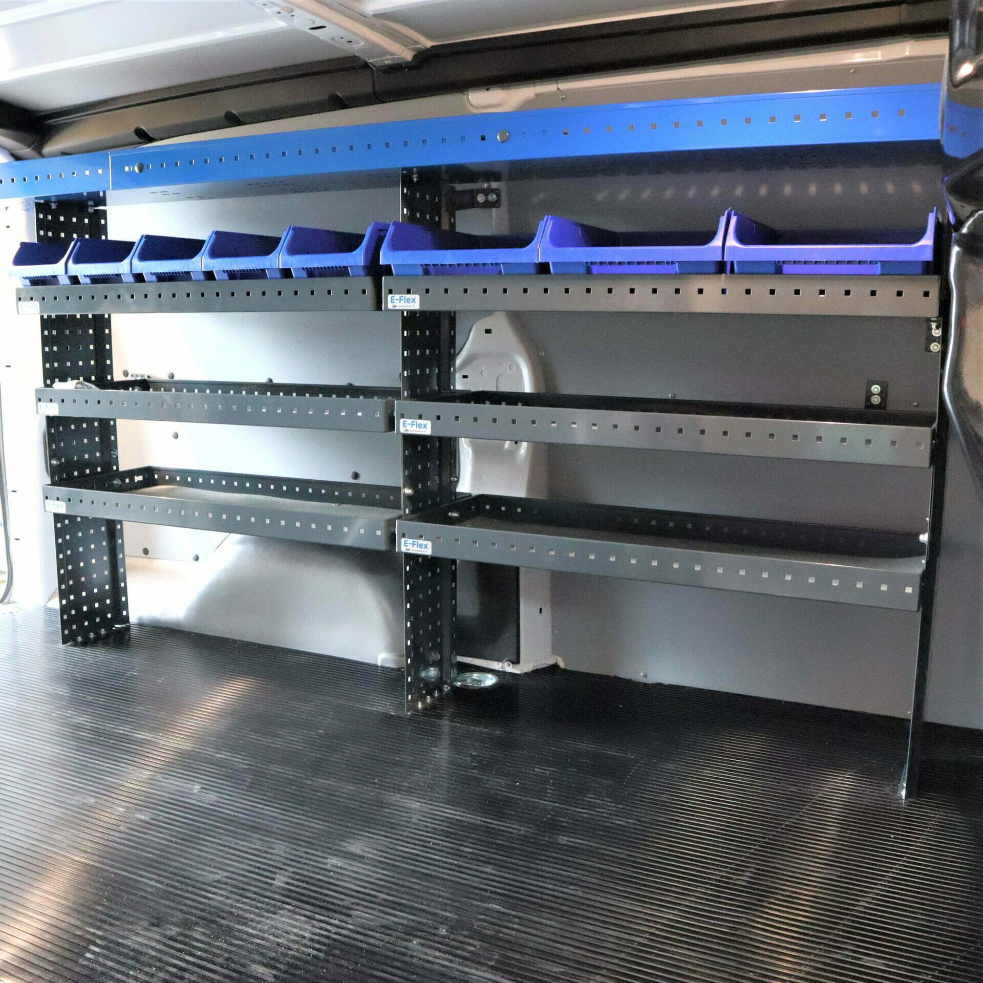 E-Flex 200 cm pakettiauton hylly neljällä korkeus-säädettävällä hyllytasolla. Avohylly pitää pakettiauton järjestyksessä tyylikkäästi ja helposti.