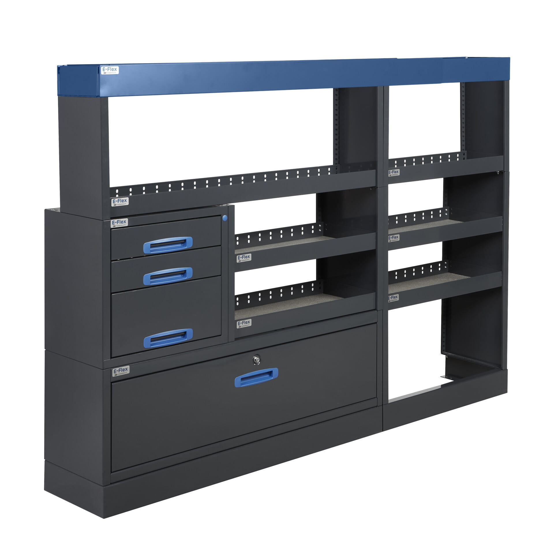 Jämerät E-Flex pakettiauton hyllyköt / laatikostot ovat suosittuja ja monipuolisia pakettiauton kalusteita. Kalusteessa on yhdistetty vetolaatikoita, avohyllyjä ja muita säilytystiloja. Hyllykkö- / laatikostojen pääväri on pulverimaalattu antrasiitti ja toisena värinä on tyylikäs pulverimaalattu sininen. Moduuleista koosttuvat tuotekokonaisuudet on helppo ja selkeä kasata sekä asentaa. Tuotekokonaisuudet ovat moduulirakenteensa vuoksi myös hyvin muunneltavissa. Vetolaatikostojen kiskot ovat kuulalaakeroituja (kantavuus 40 kg) ja tehty nimenomaan pakettiautoja varten eli laatikot lukittuvat paikalleen sekä auki että kiinni -asennoissa eivätkä aukeile itsekseen ajon aikana. Annamme tuotteille 10 vuoden takuun, joka takaa että nämä todella kestävät vaativammassakin ammattikäytössä. Täydennä kalusteesi tarvittavilla lisävarusteilla.