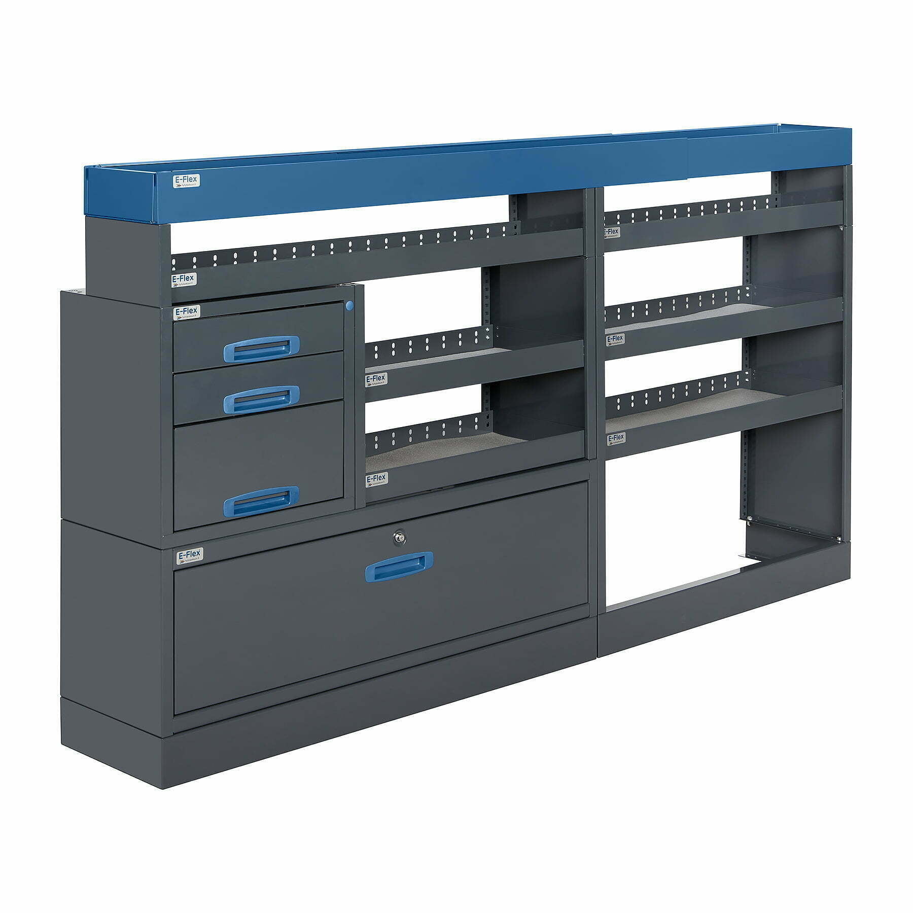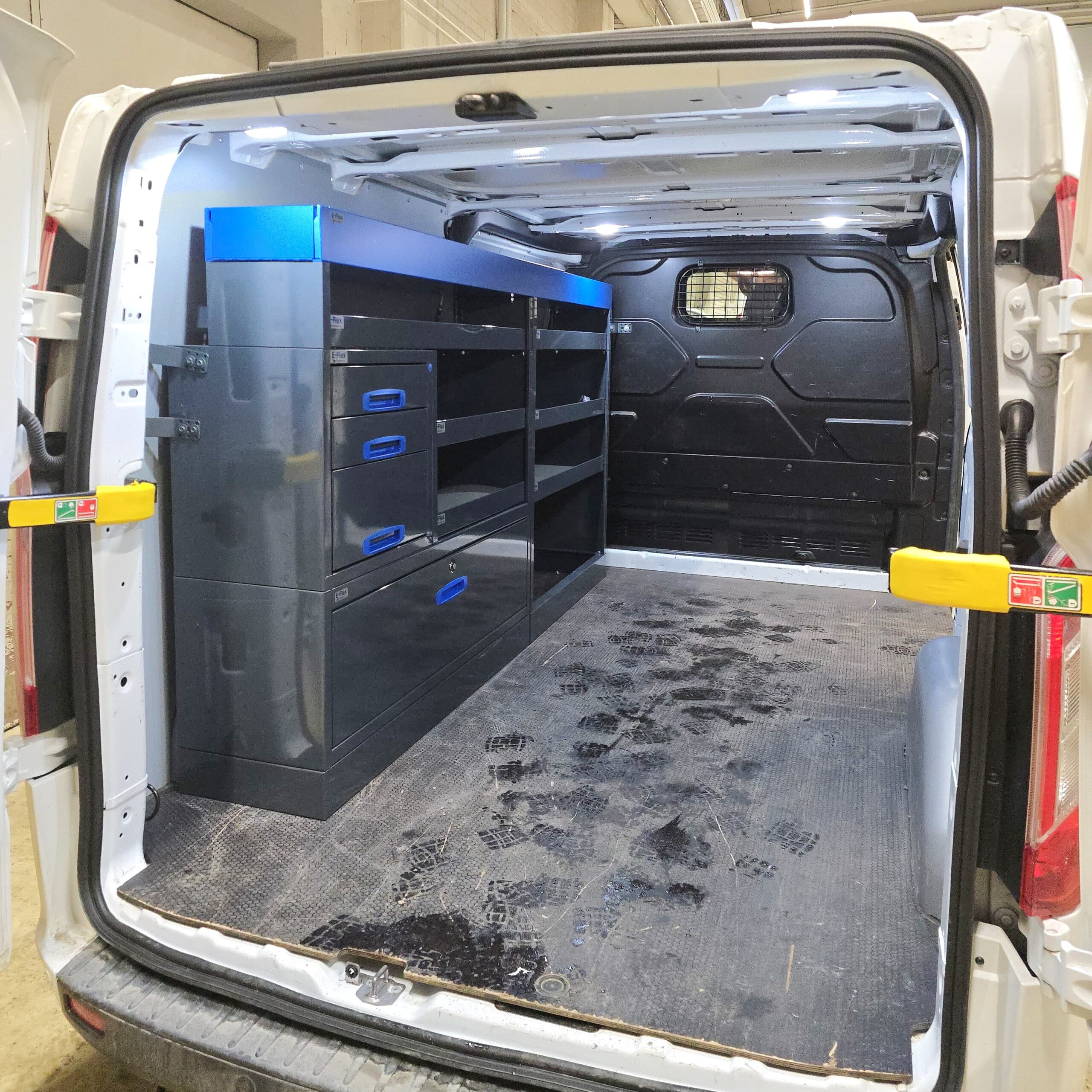 Jämerät E-Flex pakettiauton hyllyköt / laatikostot ovat suosittuja ja monipuolisia pakettiauton kalusteita. Kalusteessa on yhdistetty vetolaatikoita, avohyllyjä ja muita säilytystiloja. Hyllykkö- / laatikostojen pääväri on pulverimaalattu antrasiitti ja toisena värinä on tyylikäs pulverimaalattu sininen. Moduuleista koosttuvat tuotekokonaisuudet on helppo ja selkeä kasata sekä asentaa. Tuotekokonaisuudet ovat moduulirakenteensa vuoksi myös hyvin muunneltavissa. Vetolaatikostojen kiskot ovat kuulalaakeroituja (kantavuus 40 kg) ja tehty nimenomaan pakettiautoja varten eli laatikot lukittuvat paikalleen sekä auki että kiinni -asennoissa eivätkä aukeile itsekseen ajon aikana. Annamme tuotteille 10 vuoden takuun, joka takaa että nämä todella kestävät vaativammassakin ammattikäytössä. Täydennä kalusteesi tarvittavilla lisävarusteilla.