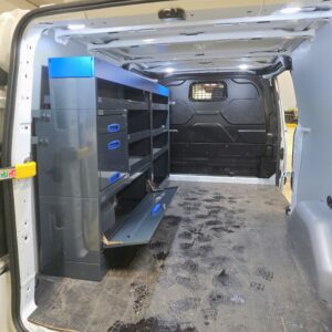 Tämä hylly on suosittu Ford Transit Custom vanhaan malliin (vuosimallit 2013-2023). Tässä kalusteessa on huomioitu sokkeleilla riittävä tila autossa olevalle korkeammalle takapyörän kotelolle