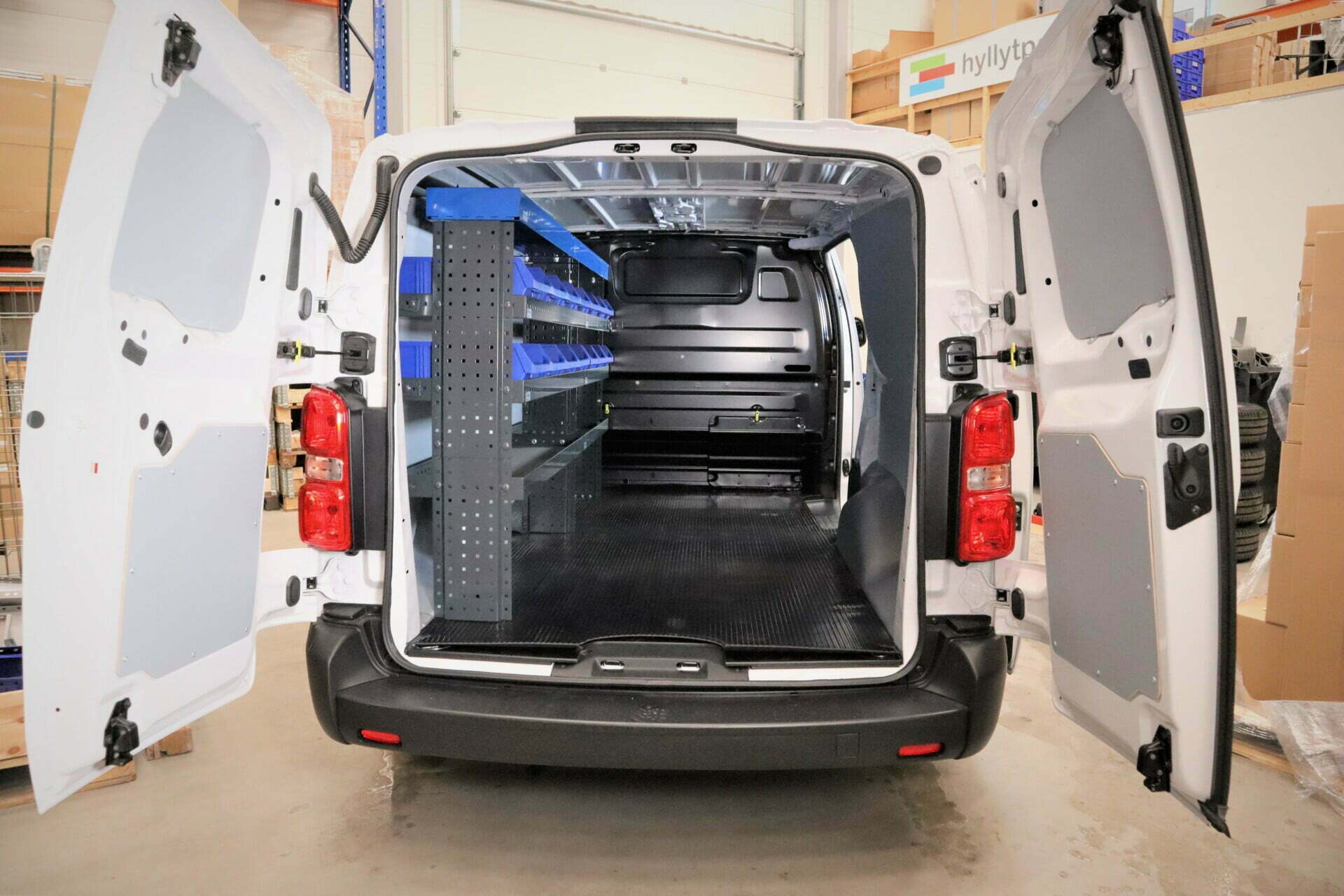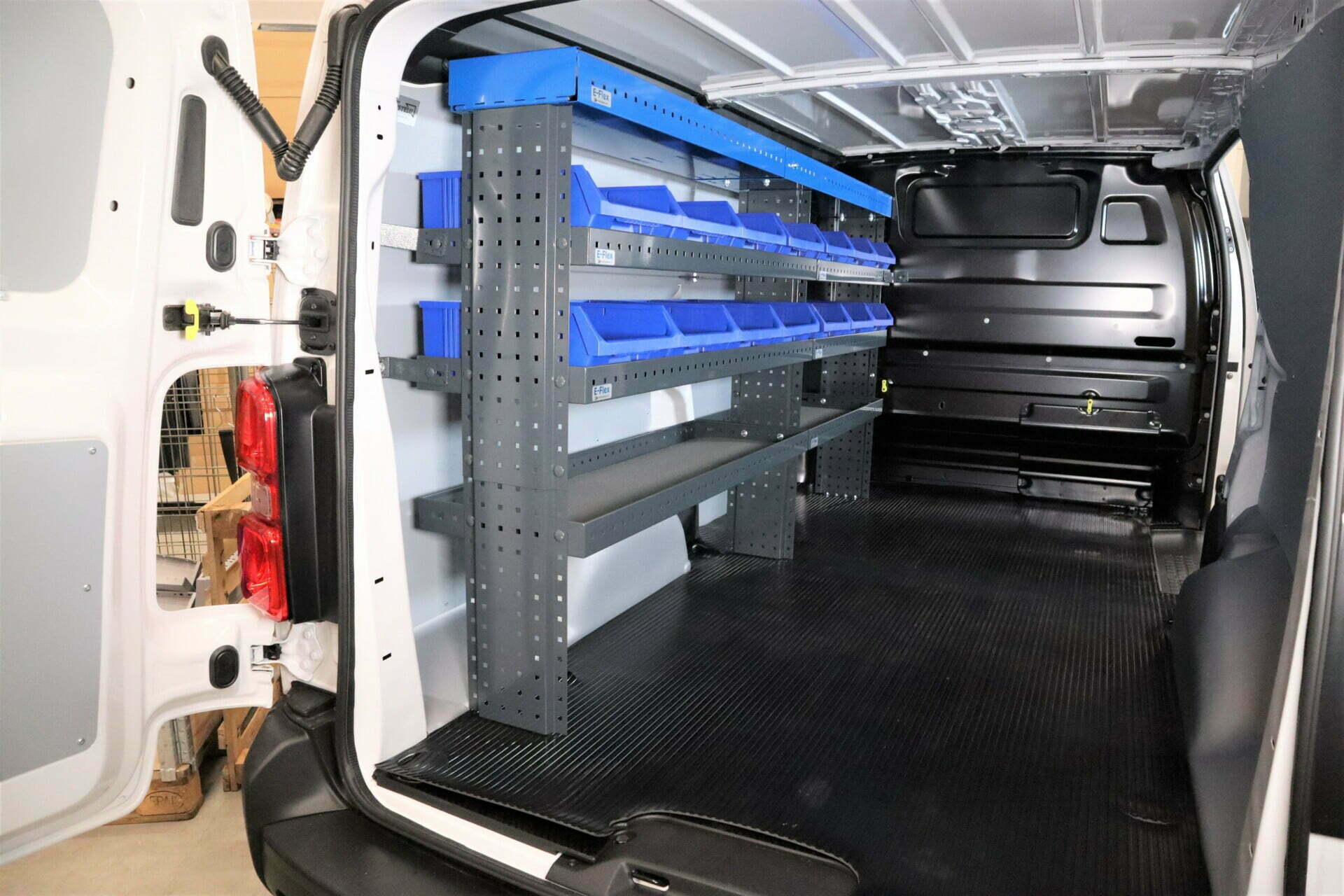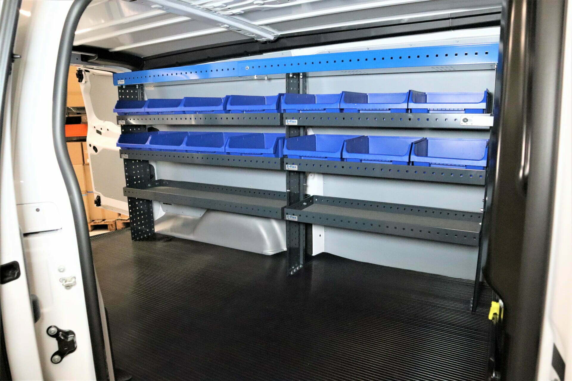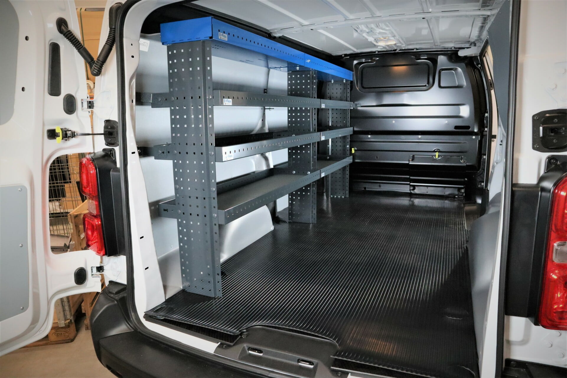 E-Flex 230 cm pakettiauton hylly neljällä korkeus-säädettävällä hyllytasolla. Avohylly pitää pakettiauton järjestyksessä tyylikkäästi ja helposti.