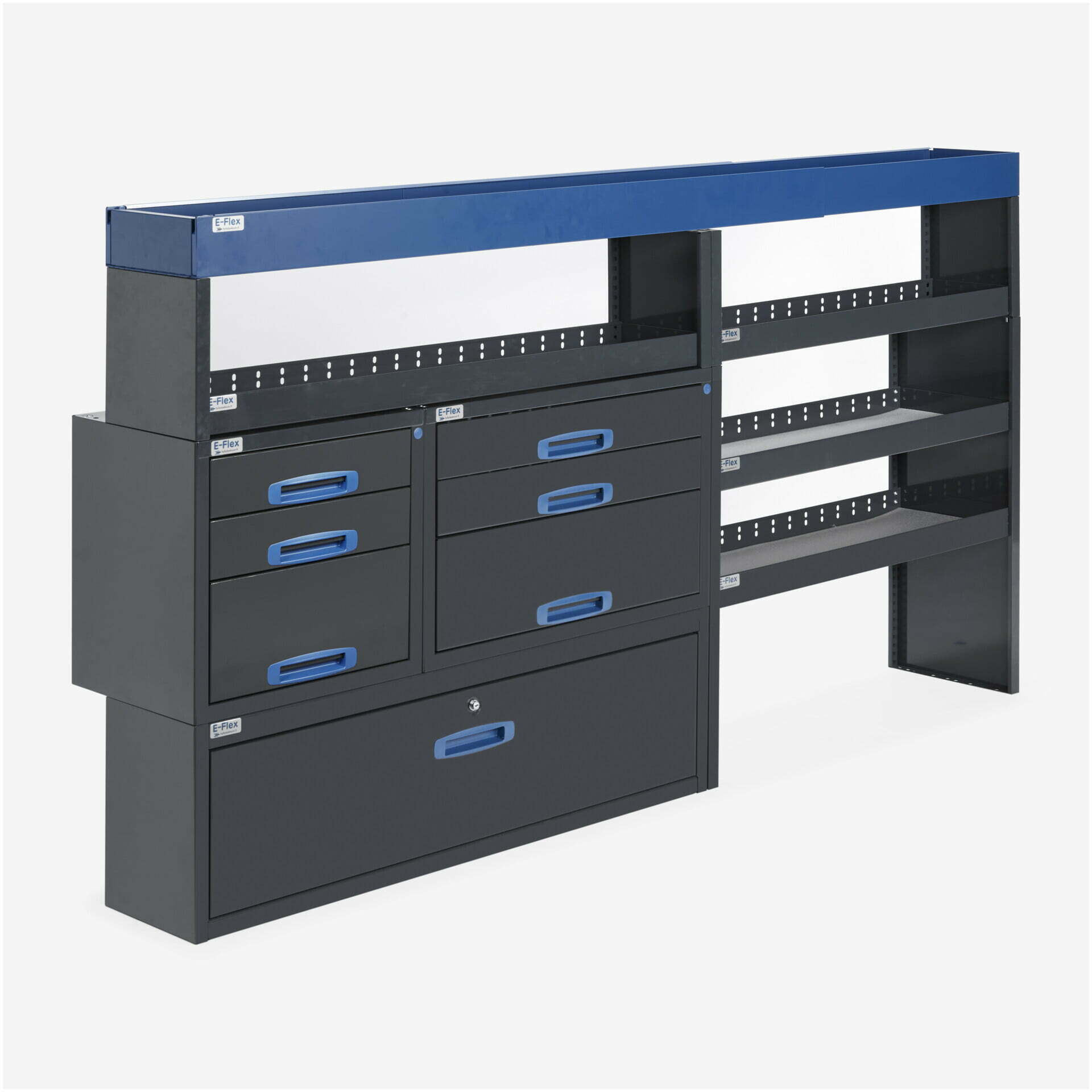 Jämerät E-Flex pakettiauton hyllyköt / laatikostot ovat suosittuja ja monipuolisia pakettiauton kalusteita. Kalusteessa on yhdistetty vetolaatikoita, avohyllyjä ja muita säilytystiloja. Hyllykkö- / laatikostojen pääväri on pulverimaalattu antrasiitti ja toisena värinä on tyylikäs pulverimaalattu sininen. Moduuleista koosttuvat tuotekokonaisuudet on helppo ja selkeä kasata sekä asentaa. Tuotekokonaisuudet ovat moduulirakenteensa vuoksi myös hyvin muunneltavissa. Vetolaatikostojen kiskot ovat kuulalaakeroituja (kantavuus 40 kg) ja tehty nimenomaan pakettiautoja varten eli laatikot lukittuvat paikalleen sekä auki että kiinni -asennoissa eivätkä aukeile itsekseen ajon aikana. Annamme tuotteille 10 vuoden takuun, joka takaa että nämä todella kestävät vaativammassakin ammattikäytössä. Täydennä kalusteesi tarvittavilla lisävarusteilla.