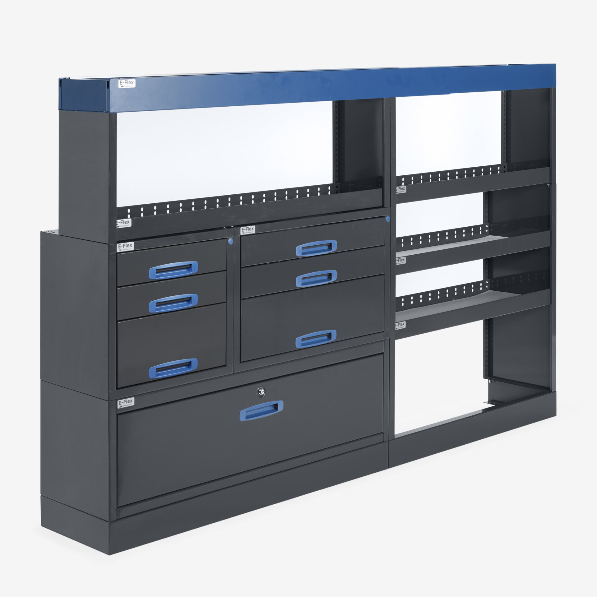 Jämerät E-Flex pakettiauton hyllyköt / laatikostot ovat suosittuja ja monipuolisia pakettiauton kalusteita. Kalusteessa on yhdistetty vetolaatikoita, avohyllyjä ja muita säilytystiloja. Hyllykkö- / laatikostojen pääväri on pulverimaalattu antrasiitti ja toisena värinä on tyylikäs pulverimaalattu sininen. Moduuleista koosttuvat tuotekokonaisuudet on helppo ja selkeä kasata sekä asentaa. Tuotekokonaisuudet ovat moduulirakenteensa vuoksi myös hyvin muunneltavissa. Vetolaatikostojen kiskot ovat kuulalaakeroituja (kantavuus 40 kg) ja tehty nimenomaan pakettiautoja varten eli laatikot lukittuvat paikalleen sekä auki että kiinni -asennoissa eivätkä aukeile itsekseen ajon aikana. Annamme tuotteille 10 vuoden takuun, joka takaa että nämä todella kestävät vaativammassakin ammattikäytössä. Täydennä kalusteesi tarvittavilla