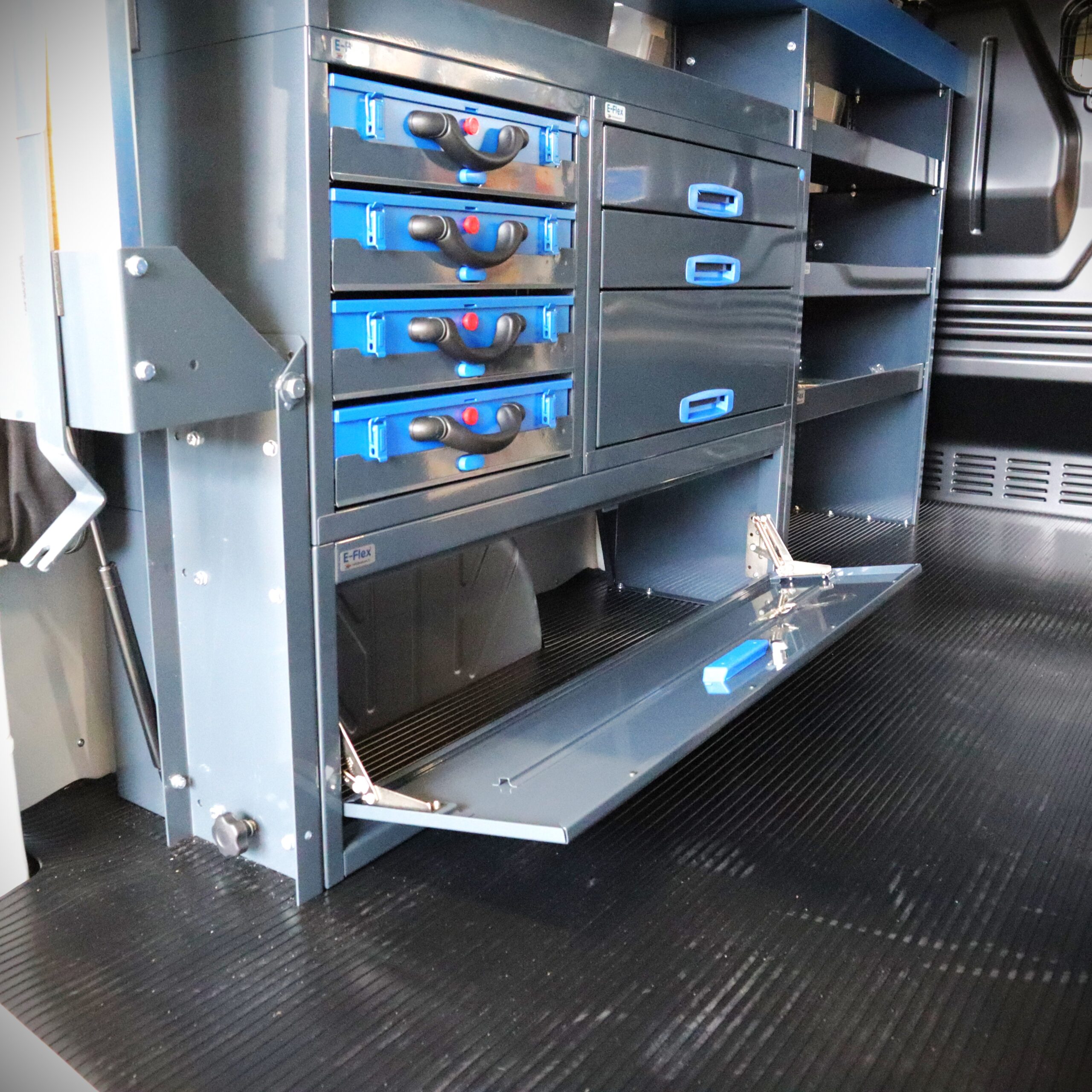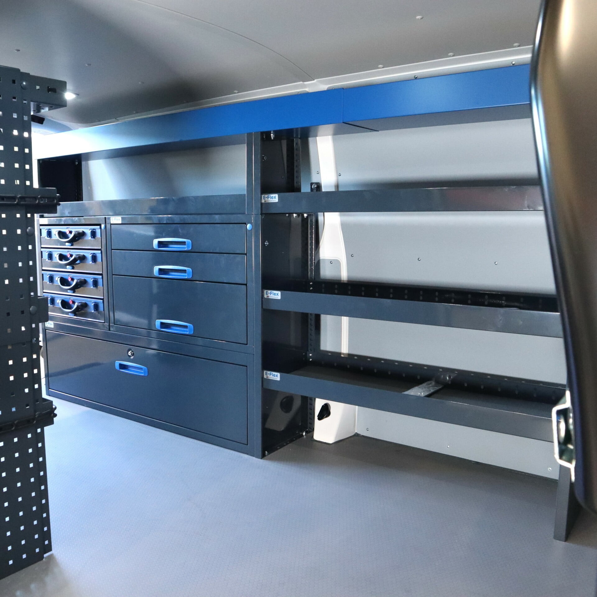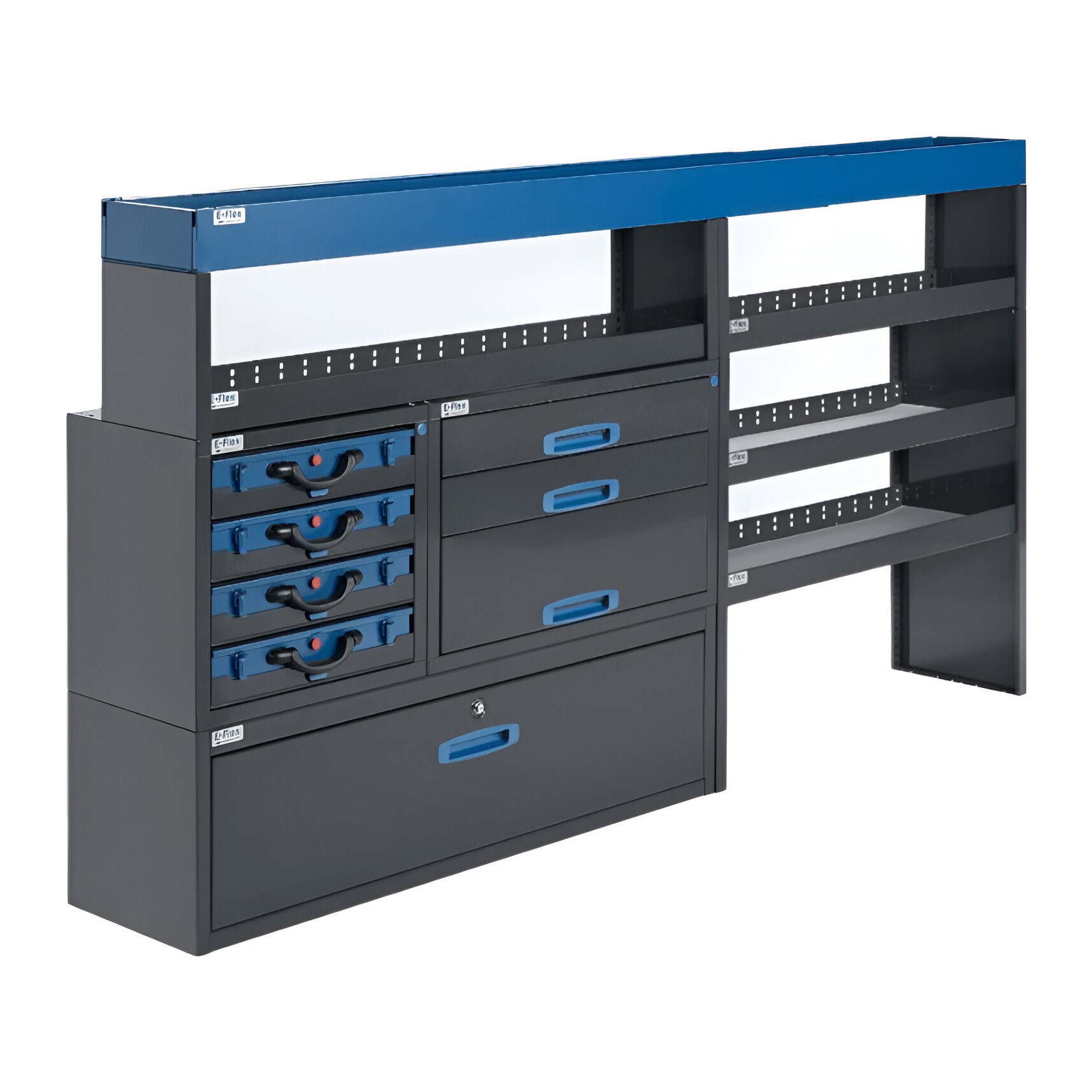 Tämä hyllyjärjestelmä on suunniteltu L2H1-kokoluokan pakettiautoihin ja sopii erityisesti malleihin kuten Ford Transit Custom L2 pitkä, M-B Vito pitkä, Nissan Primastar pitkä, Renault Trafic pitkä, VW Transporter pitkä. Järjestelmä yhdistää vetolaatikot, avohyllyt ja säilytystilat, tarjoten monipuolisen ja muunneltavan säilytysratkaisun ammattilaiskäyttöön. Pulverimaalattu antrasiitti ja sininen väri tekevät siitä tyylikkään ja kestävän vaihtoehdon. Kuulalaakeroidut vetolaatikot lukittuvat turvallisesti eivätkä aukea ajon aikana. Tuotteelle myönnetään 10 vuoden takuu, mikä takaa sen kestävyyden vaativissakin olosuhteissa. Täydennä kalusteesi tarvittavilla lisävarusteilla.