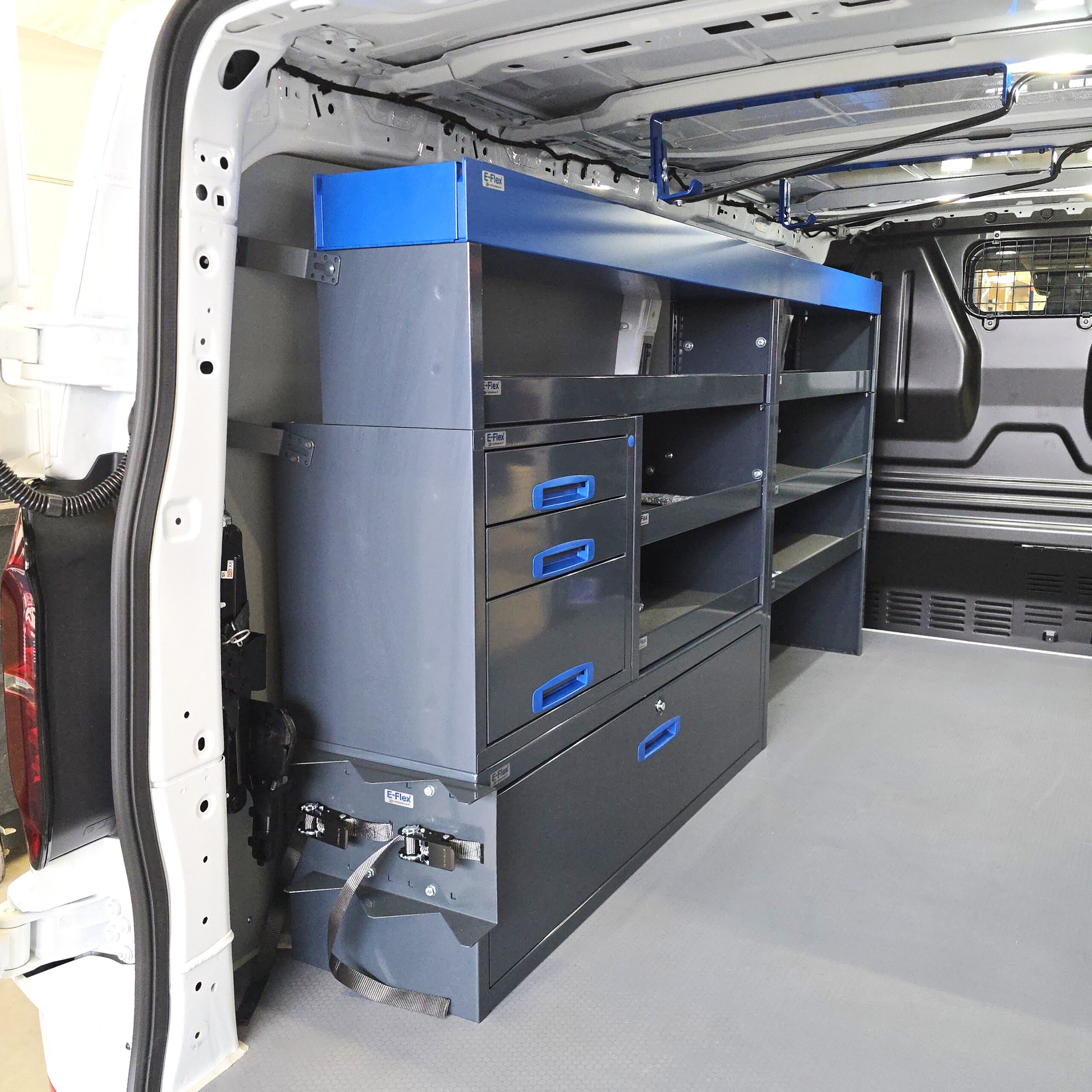 Tämä hyllyjärjestelmä on suunniteltu L2H1-kokoluokan pakettiautoihin ja sopii erityisesti malleihin kuten Ford Transit Custom L2 pitkä, M-B Vito pitkä, Nissan Primastar pitkä, Renault Trafic pitkä, VW Transporter pitkä. Järjestelmä yhdistää vetolaatikot, avohyllyt ja säilytystilat, tarjoten monipuolisen ja muunneltavan säilytysratkaisun ammattilaiskäyttöön. Pulverimaalattu antrasiitti ja sininen väri tekevät siitä tyylikkään ja kestävän vaihtoehdon. Kuulalaakeroidut vetolaatikot lukittuvat turvallisesti eivätkä aukea ajon aikana. Tuotteelle myönnetään 10 vuoden takuu, mikä takaa sen kestävyyden vaativissakin olosuhteissa.Täydennä kalusteesi tarvittavilla lisävarusteilla.