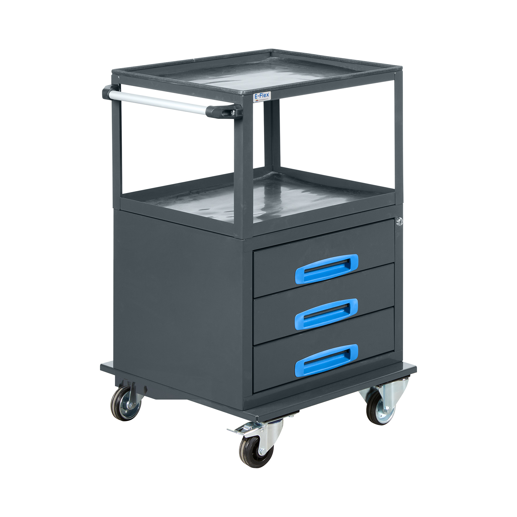 E-Flex 50 cm työkaluvaunu vetolaatikoilla on kompakti ja kestävä ratkaisu, joka on suunniteltu kestämään kovaa käyttöä. Vaunussa on kolme kuulalaakeroitua vetolaatikkoa, jotka tarjoavat helposti käytettävää säilytystilaa pienemmille työkaluille. Lisäksi siinä on kaksi kiinteää hyllytasoa, jotka soveltuvat isompien tarvikkeiden säilyttämiseen. Vaunun kiinteä työtaso on asetettu optimaaliselle työkorkeudelle, mikä takaa ergonomisen ja tehokkaan työskentelyn.
