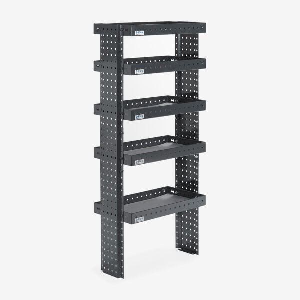 E-Flex 60 cm Pakettiauton hylly viidellä korkeus-säädettävällä hyllytasolla. Avohylly pitää pakettiauton järjestyksessä tyylikkäästi ja helposti.