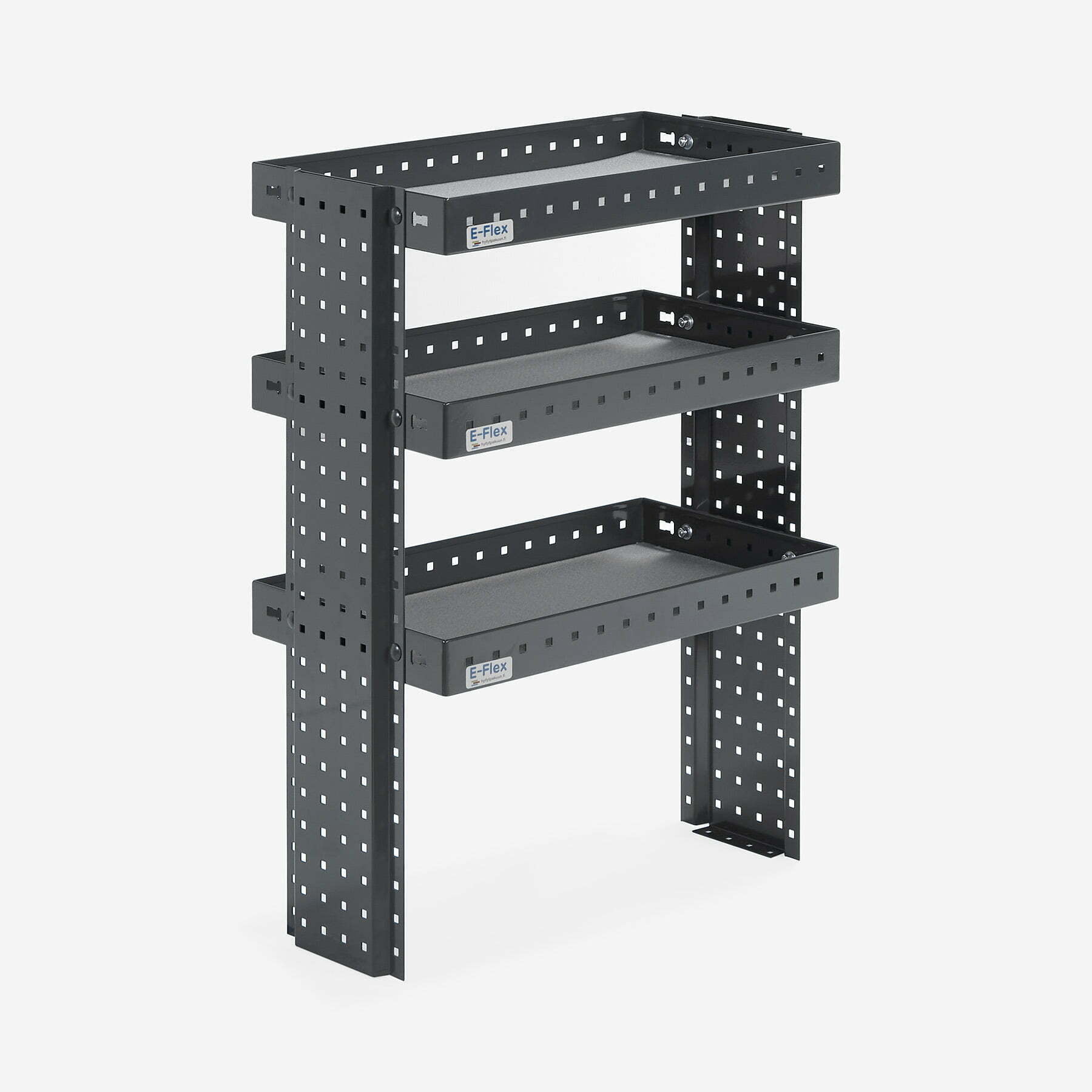 E-Flex 60 cm pakettiauton hylly kolmella korkeus-säädettävällä hyllytasolla. Avohylly pitää pakettiauton järjestyksessä tyylikkäästi ja helposti.