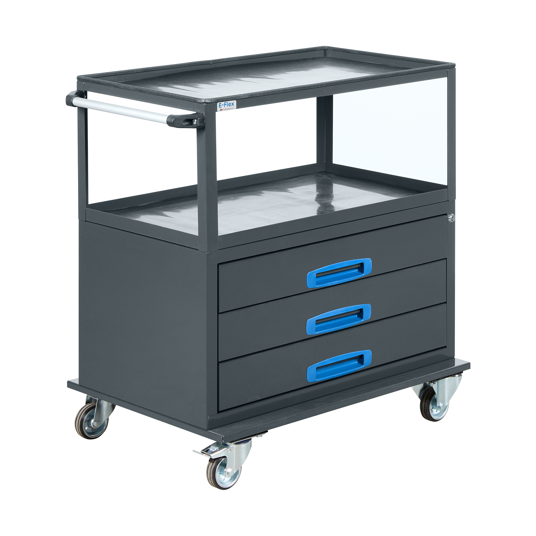 E-Flex 76 cm työkaluvaunu vetolaatikoilla on kompakti ja kestävä ratkaisu, joka on suunniteltu kestämään kovaa käyttöä. Vaunussa on kolme kuulalaakeroitua vetolaatikkoa, jotka tarjoavat helposti käytettävää säilytystilaa pienemmille työkaluille. Lisäksi siinä on kaksi kiinteää hyllytasoa, jotka soveltuvat isompien tarvikkeiden säilyttämiseen. Vaunun kiinteä työtaso on asetettu optimaaliselle työkorkeudelle, mikä takaa ergonomisen ja tehokkaan työskentelyn.