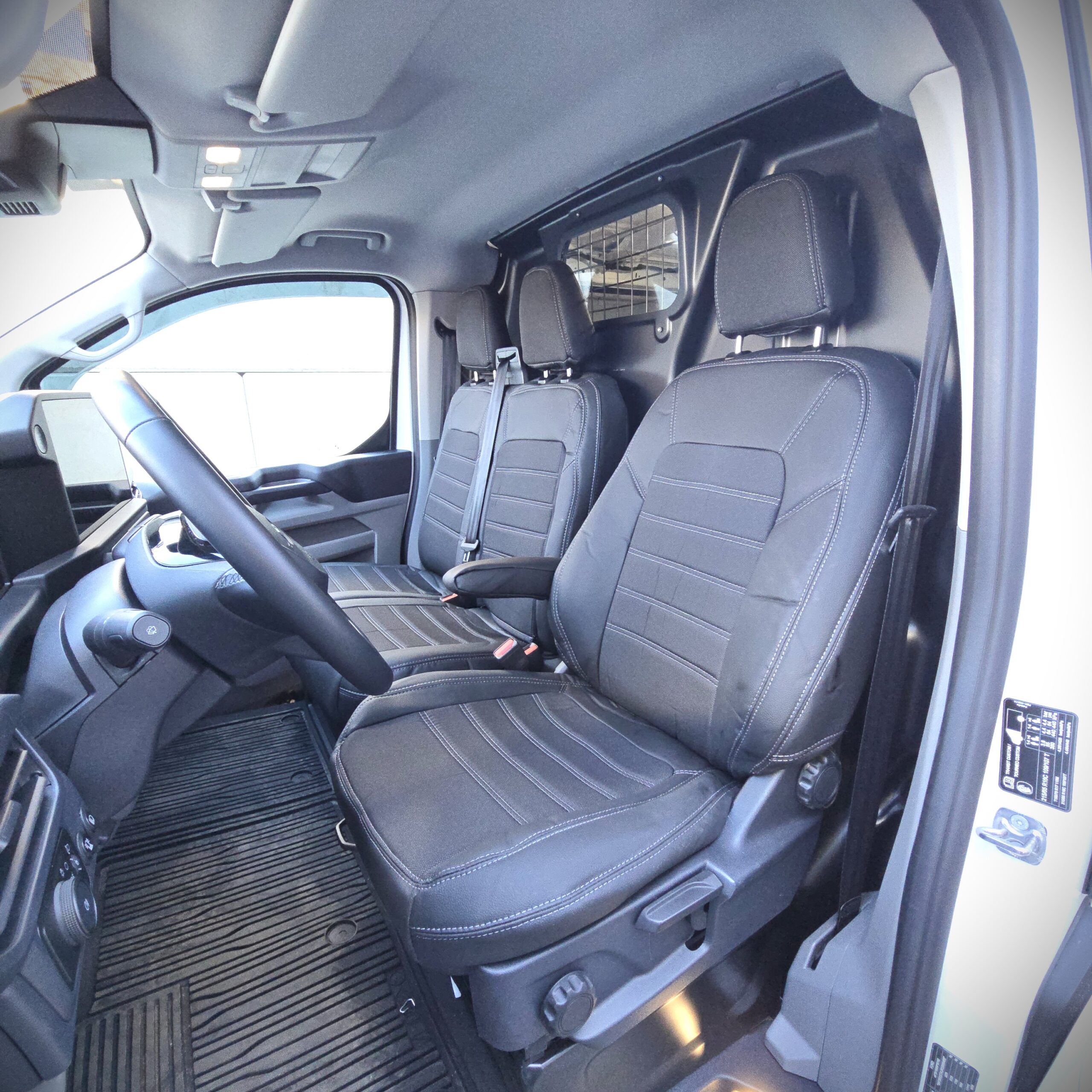 Kestävät ja tyylikkäät istuinsuojat Ford Transit Custom 2024 mallin 1+2 etupenkeille. Reunoissa kulutusta kestävä keinonahka ja keskiosissa hengittävä kangas. Tämä yhdistelmä tarjoaa erinomaisen suojan sekä mukavan istuinpinnan pitkillekin työmatkoille.