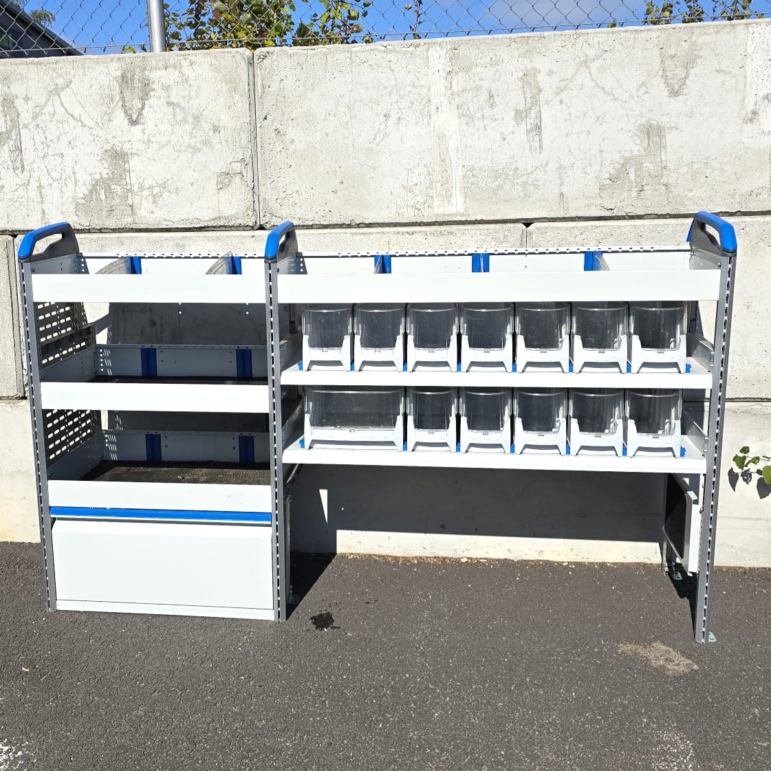Kokonaisuus on erittäin siistissä kunnossa ja tarjoaa kattavan ratkaisun pakettiauton järjestyksen tehostamiseen. Tämä on todellinen löytö ammattilaiselle, joka etsii laadukasta ja monipuolista hyllyratkaisua edullisesti käytettynä.