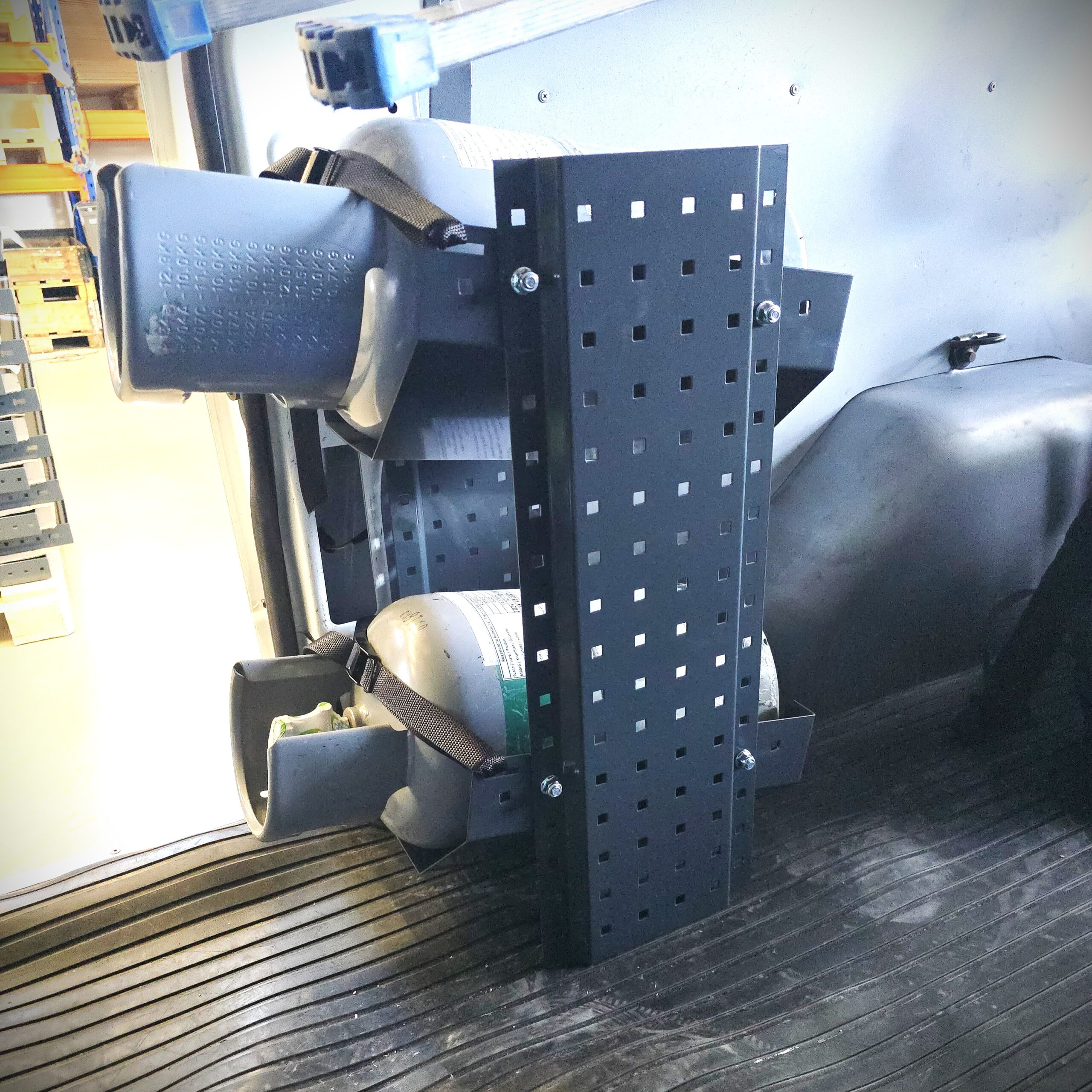 Naapurissamme toimii kylmäalan yritys, jolle olemme vuosien mittaan toimittaneet kymmeniä pakettiauton hyllyjä. Ajan myötä keskusteluissamme nousi esiin heidän jokapäiväinen haasteensa: kylmäainepullot. Kaikissa heidän autoissaan kuljetetaan kylmäainepulloja, mutta sopivan säilytyspaikan löytäminen on ollut vaikeaa.