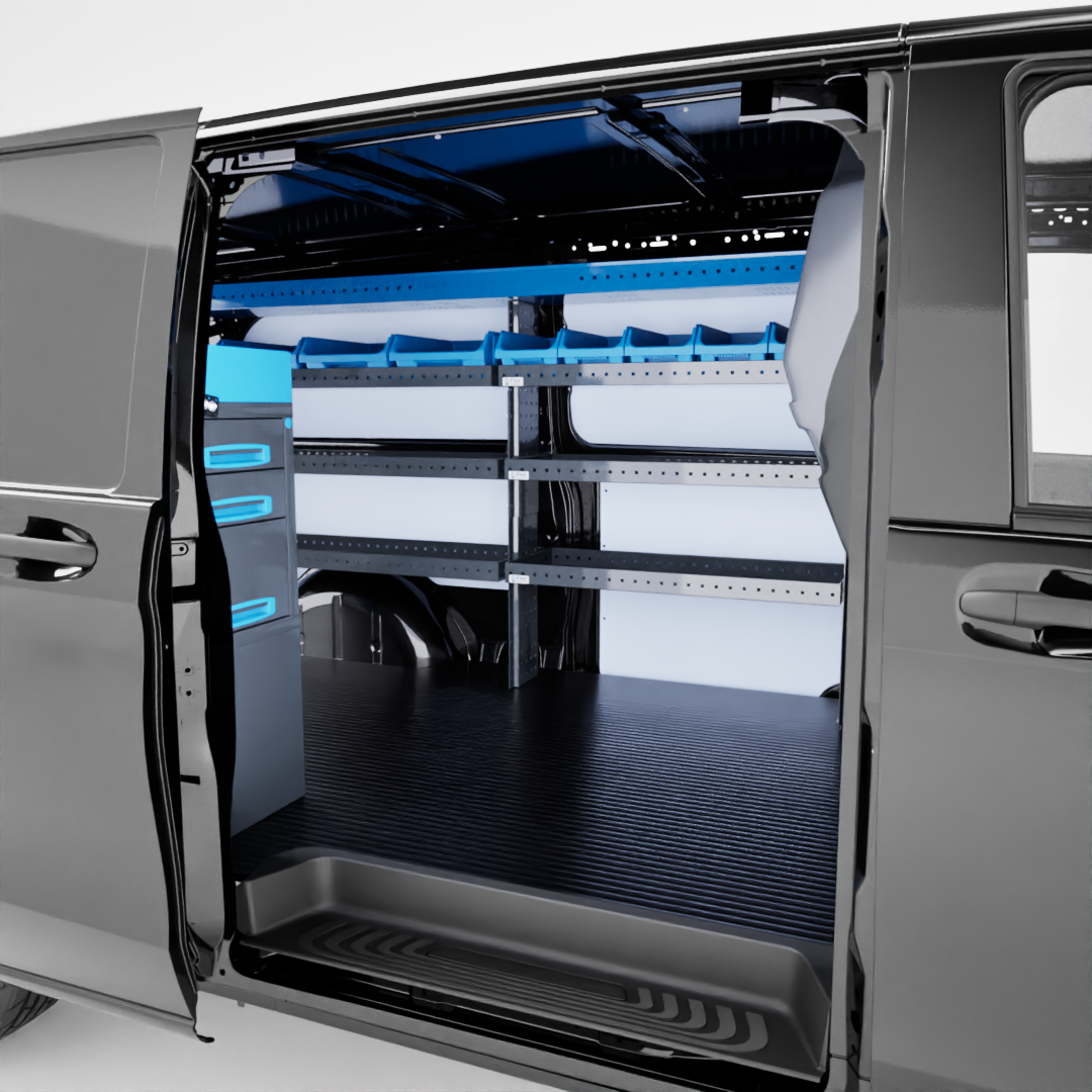 Tämä valmis hyllyvarustelupaketti on suunniteltu sopimaan juuri Mercedes-Benz Vito A3 -pakettiautoon, ja siihen on valittu Vito-käyttäjien suosituimmat hyllyvaihtoehdot. Hyllyvarustelu tekee pakettiauton tavaratilasta selkeän ja järjestelmällisen, mikä helpottaa työskentelyä ja säästää aikaa, kun kaikki tarvittava löytyy helposti.