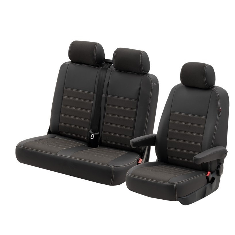 Ensiluokkaiset istuinsuojat Volkswagen Transporter T7:n etupenkkeihin 1+2 kokoonpanolla. Kestävä puolikeinonahka kestää työajon, pitkät matkat ja aktiivisen arjen. Materiaali on helppo puhdistaa ja suojaa alkuperäisiä verhoiluja kulumiselta, lialta ja nesteiltä.